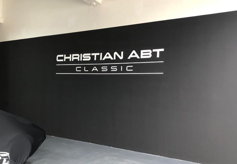 Diese Wand hat einen besonderen Effekt: Mattschwarz mit dem Christian Abt Firmenlogo in weiß.